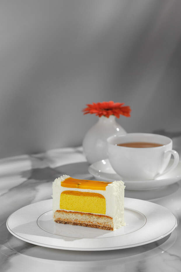 «Манговый лес» — лёгкий и воздушный десерт без глютена и лактозы: кокосовый дакуаз с хрустящей прослойкой, нежные муссы из кокоса и манго и сочная начинка с маракуйей раскрываются в насыщенном тропическом